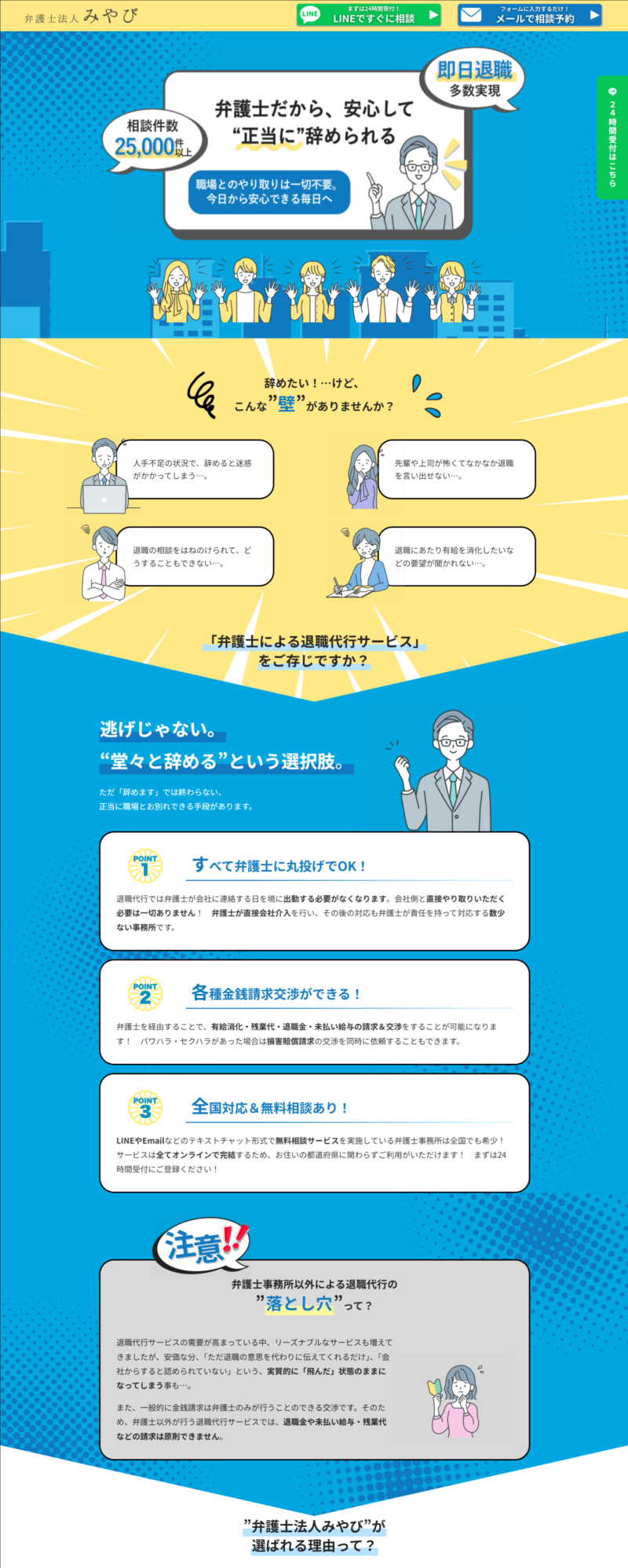 退職したいのに辞めさせてくれない、または「辞めたい」と言いづらい職場環境にいらっしゃる方、 退職希望のあなたに代わって退職の意思を伝えて退職を実現します。 弁護士の退職代行サービスは、その名の通り、弁護士が個別に対応する退職代行サービスです。 弁護士が行うので、未払い賃金の請求、退職金請求、残業代請求、損害賠償請求など 会社と交渉が必要な事を、ご依頼者のあなたに代わり全て対応可能です! 他にも退職代行サービスを展開している会社がありますが、非弁行為に当たる可能性が否定出来ないため、 依頼者の方に不利益を被ってしまう可能性があります。 弁護士が法的根拠を元にあなたに代わり、会社と交渉致します。 全国対応しているので、退職したくても出来ない方や、弁護士以外の退職代行サービスに不安が有る方でも 安心してリーガルサービスを提供する事が可能です。  |