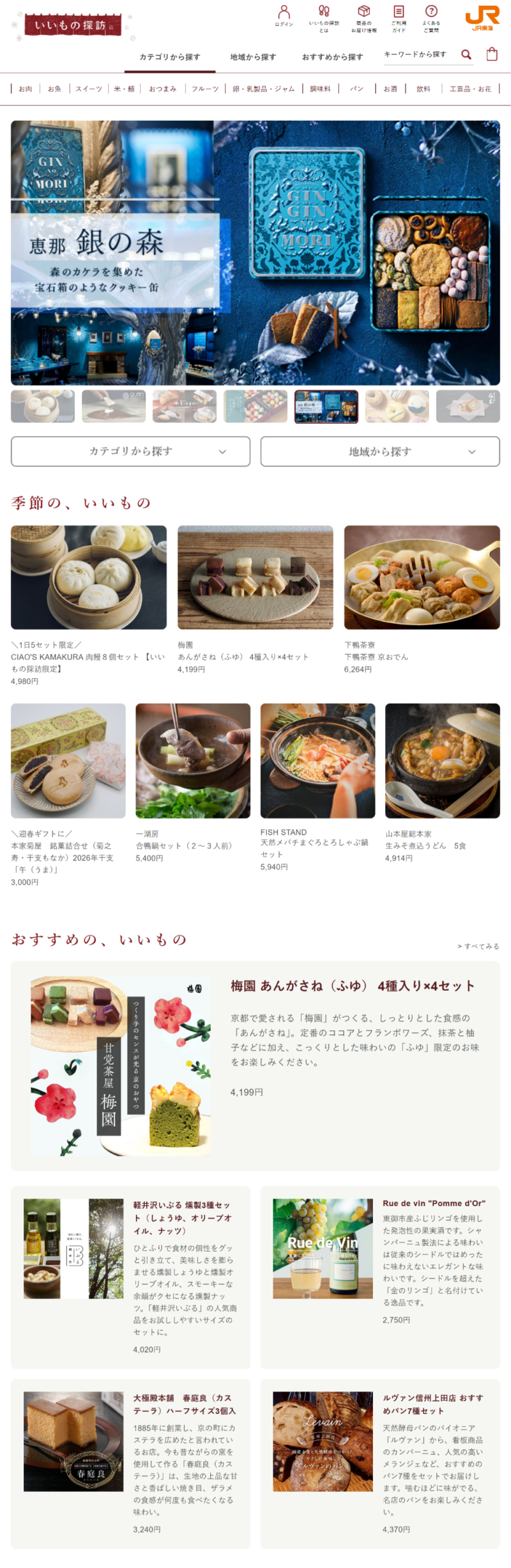 JR東海が直営する通販サイトです。 JR東海沿線の食品を中心に取り扱っています。 地元で長く愛されてきた商品や地元食材を使った商品など、 その土地に行かないとなかなか買えなかったこだわりの商品を多数取り揃えています。 また、いいもの探訪でしか買えない、JR東海ならではの新幹線モチーフのかわいいチョコレートや バウムクーヘン、実車を忠実に再現したイラストの外箱が魅力的な三輪そうめんなど、 コラボ商品や限定品もあります。 |
